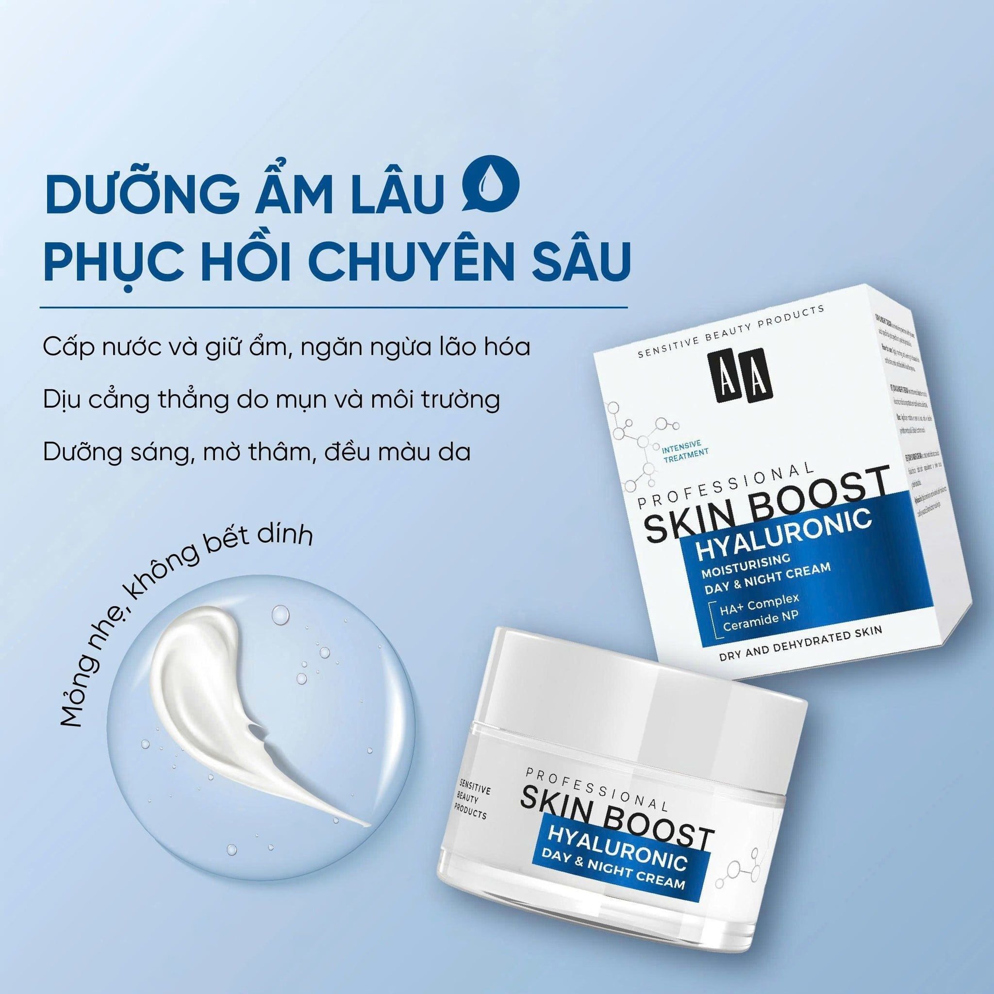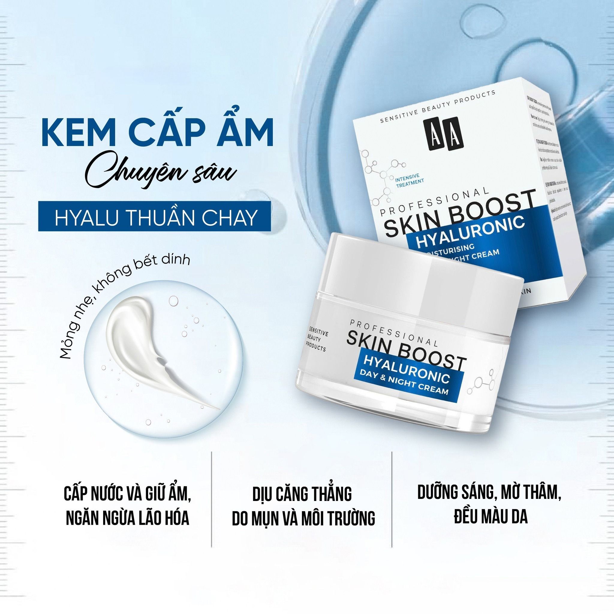 Công dụng của Kem cấp ẩm và căng mịn da AA COSMETICS Professional Skin Boost Hyaluronic Moisturizing Day & Night Cream