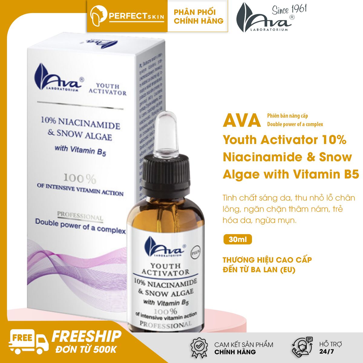 Bạn có thể tham khảo dòng sản phẩm Tinh chất sáng da, thu nhỏ lỗ chân lông AVA Youth Activator 10% Niacinamide & Snow Algae with Vitamin B5 tại Perfect Skin R&D