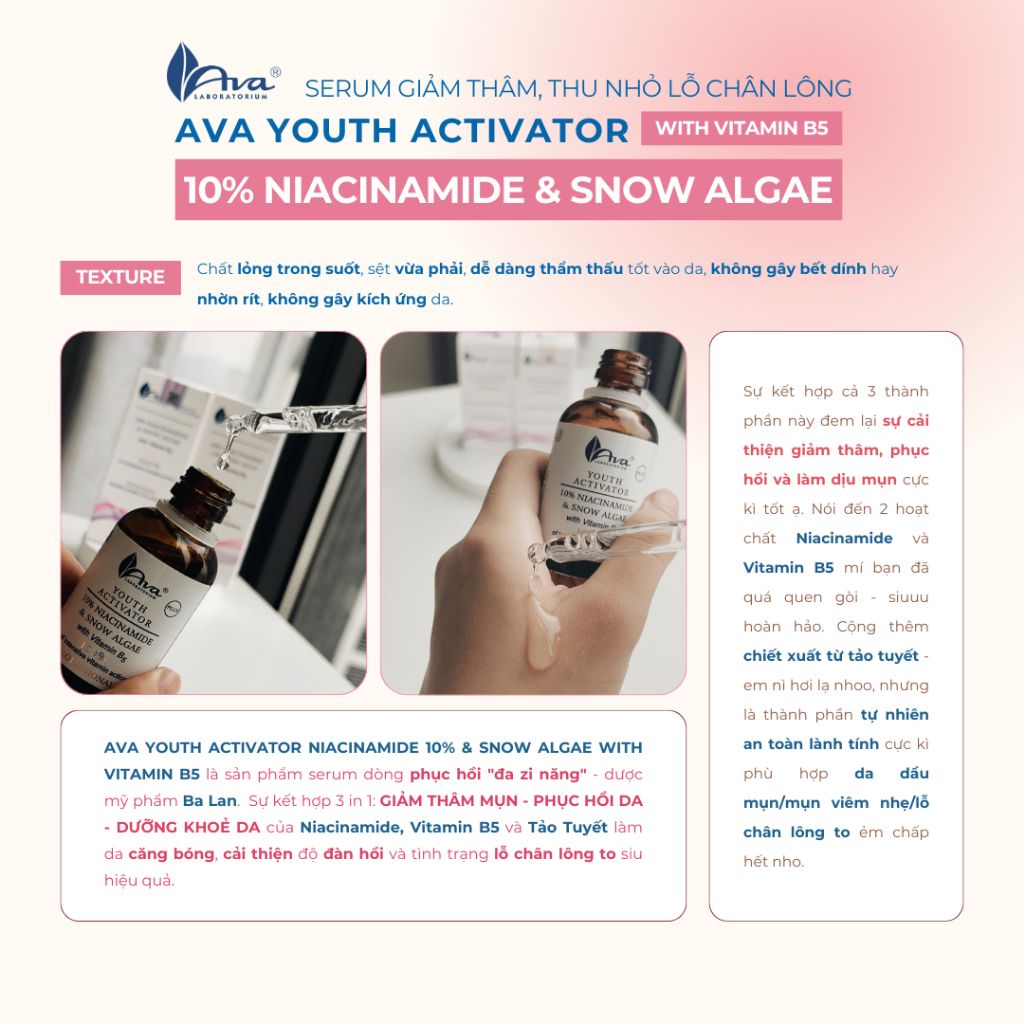 - Thoa Tinh chất sáng da, thu nhỏ lỗ chân lông AVA Youth Activator 10% Niacinamide & Snow Algae with Vitamin B5 lên da mặt đã được làm sạch. Massage để hấp thụ hoàn toàn vào da. Sử đụng mỗi sáng & tối để có kết quả tốt nhất.