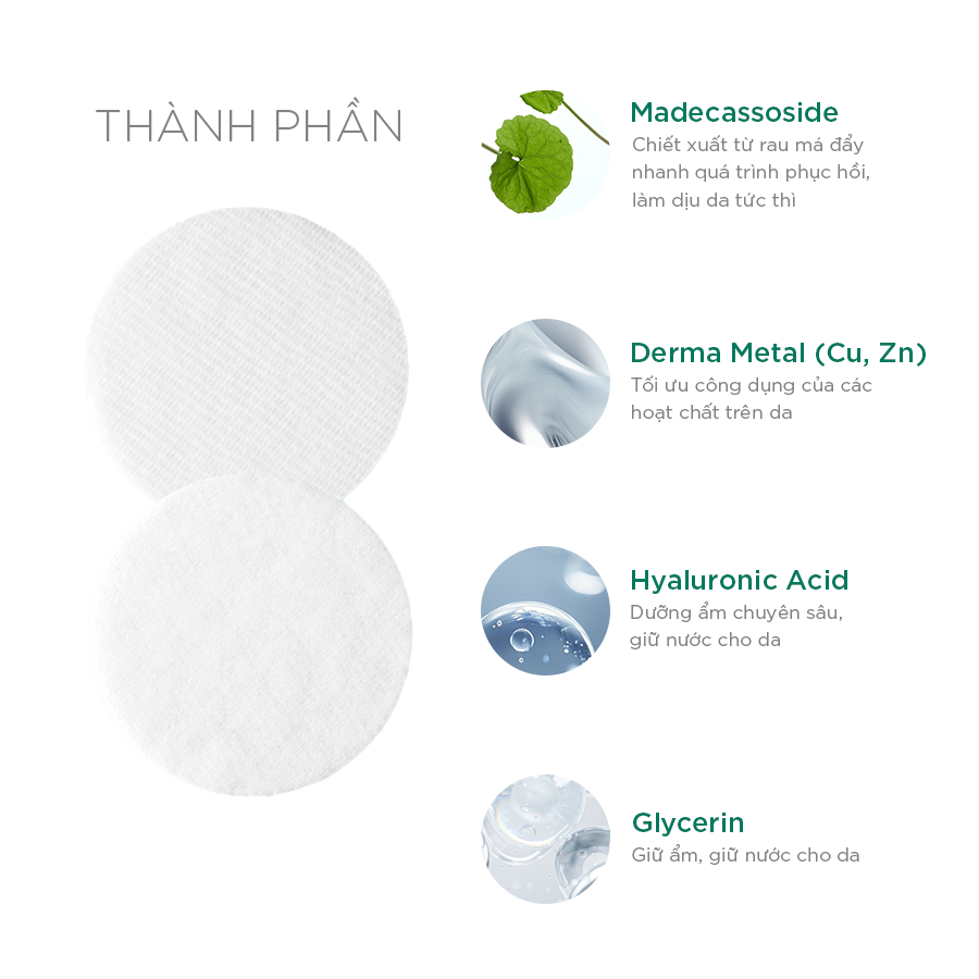 - Madecassoside: Chiết xuất từ rau má, có tác dụng làm dịu, kháng viêm, thúc đẩy quá trình phục hồi da.