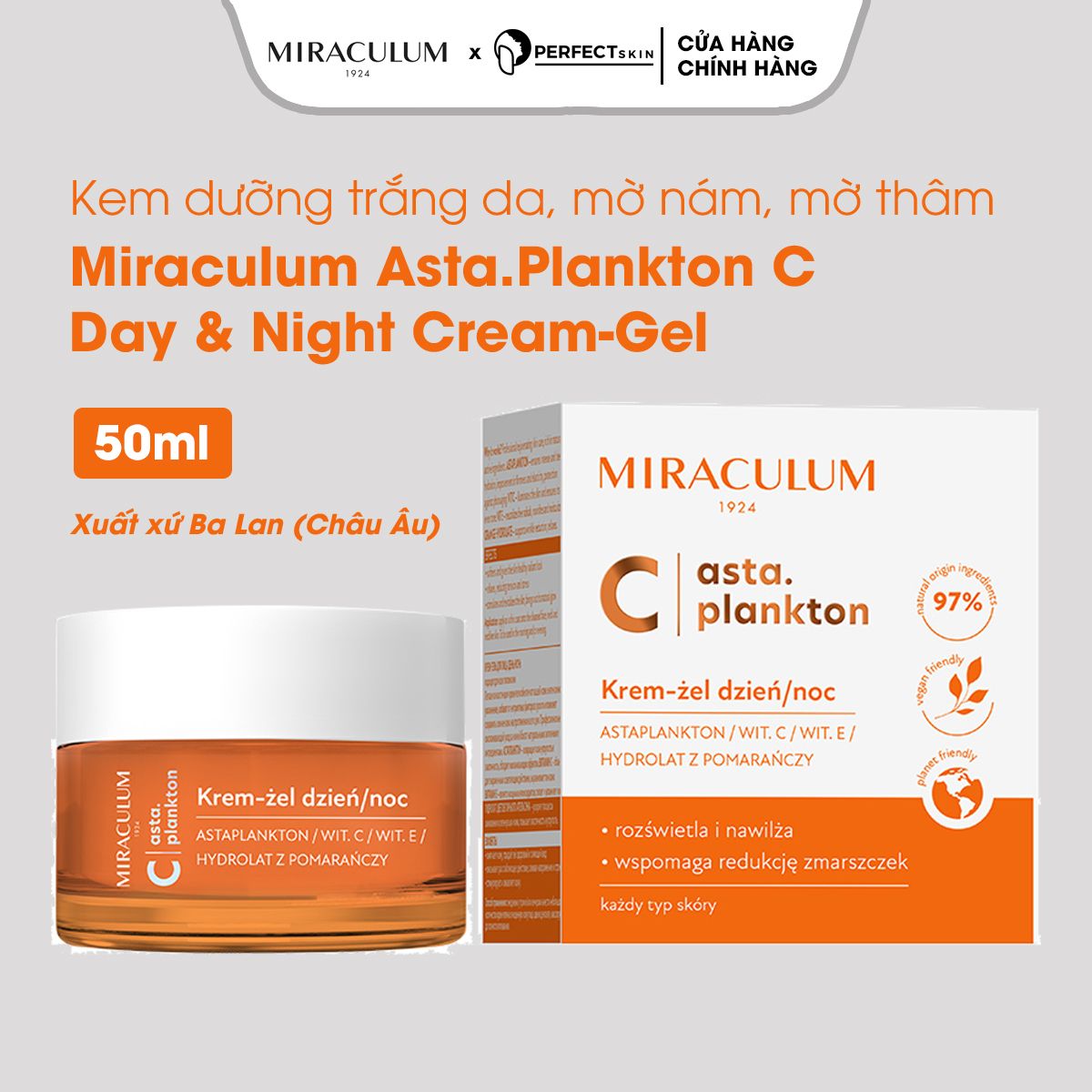 Kem dưỡng trắng da Miraculum Asta.Plankton C - Day & Night Cream-Gel là sản phẩm đến từ thương hiệu Miraculum Châu Âu. Với công thức chuyên biệt chứa Vitamin C 15%, Astaxanthin 5% và các thành phần có nguồn gốc hoàn toàn từ tự nhiên giúp làm sáng da, mờ thâm nám rõ rệt, mang lại một làn da sáng mịn săn chắc, nếp nhăn giảm đi đáng kể. Chất kem mỏng mịn, thẩm thấu nhanh trên da mà không gây nhờn rít hay bết dính. Sản phẩm được thiết kế dành cho tình trạng da sạm xỉn và không đều màu, da tăng sắc tố sau trị liệu, da thô ráp lão hóa sớm, da đang trị liệu nhạy cảm mỏng yếu cần phục hồi nhanh và muốn trắng sáng đều màu da. Sản phẩm giúp loại bỏ đốm nâu, tàn nhang, các vùng tăng sắc tố cứng đầu mang lại làn da trắng sáng, tươi trẻ rạng rỡ.