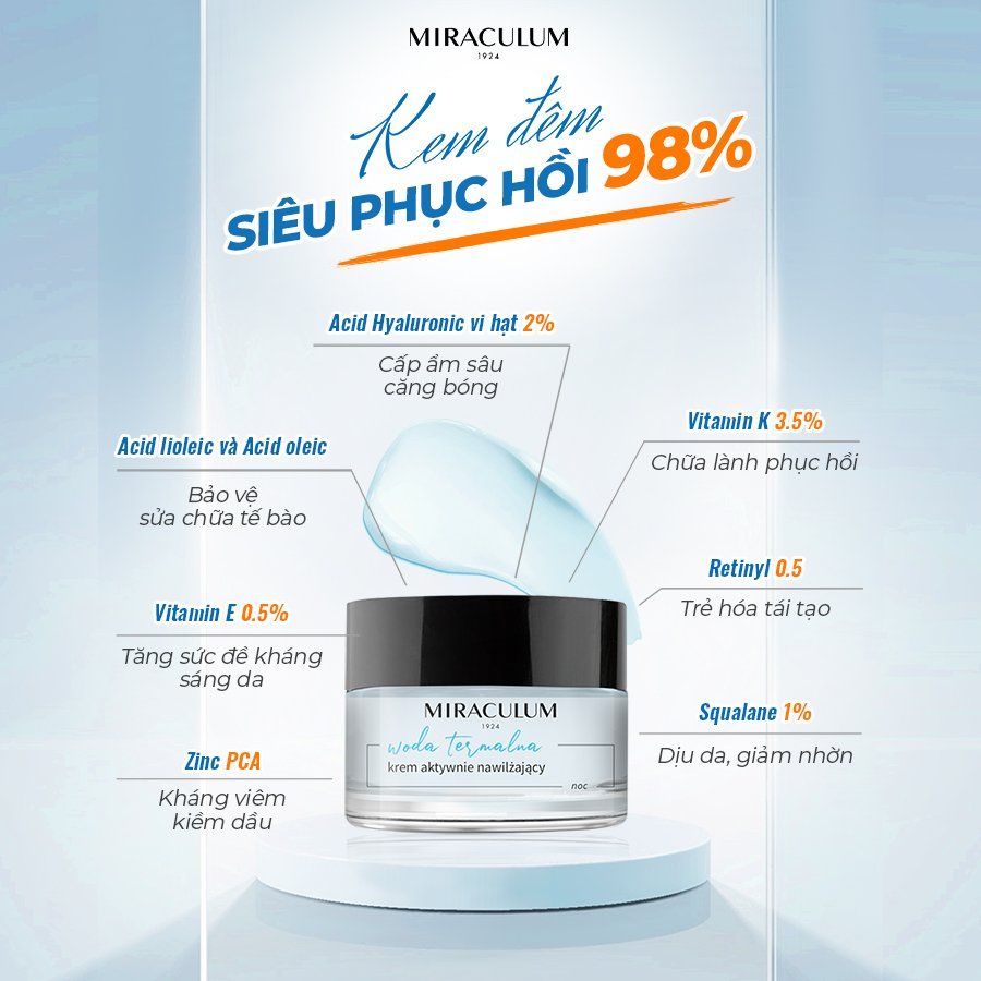 Đây là kem dưỡng phục hồi, căng bóng, tái tạo lý tưởng dành cho nền da dầu mụn. Công thức sản phẩm độc đáo giúp cấp ẩm sâu, căng bóng trẻ hóa da, cân bằng lượng dầu tiết da, làm dịu tình trạng da nhạy cảm, đồng thời chống oxy hóa và hỗ trợ các tổn thương da giúp da mau lành. Kem dưỡng ẩm ban đêm cho da dầu, siêu phục hồi Miraculum Thermal Water Actively Moisturizing Cream Night 98% nature có thể dùng lâu dài để ngăn ngừa mụn, chống lão hóa, căng bóng trẻ hóa da, se khít lỗ chân lông