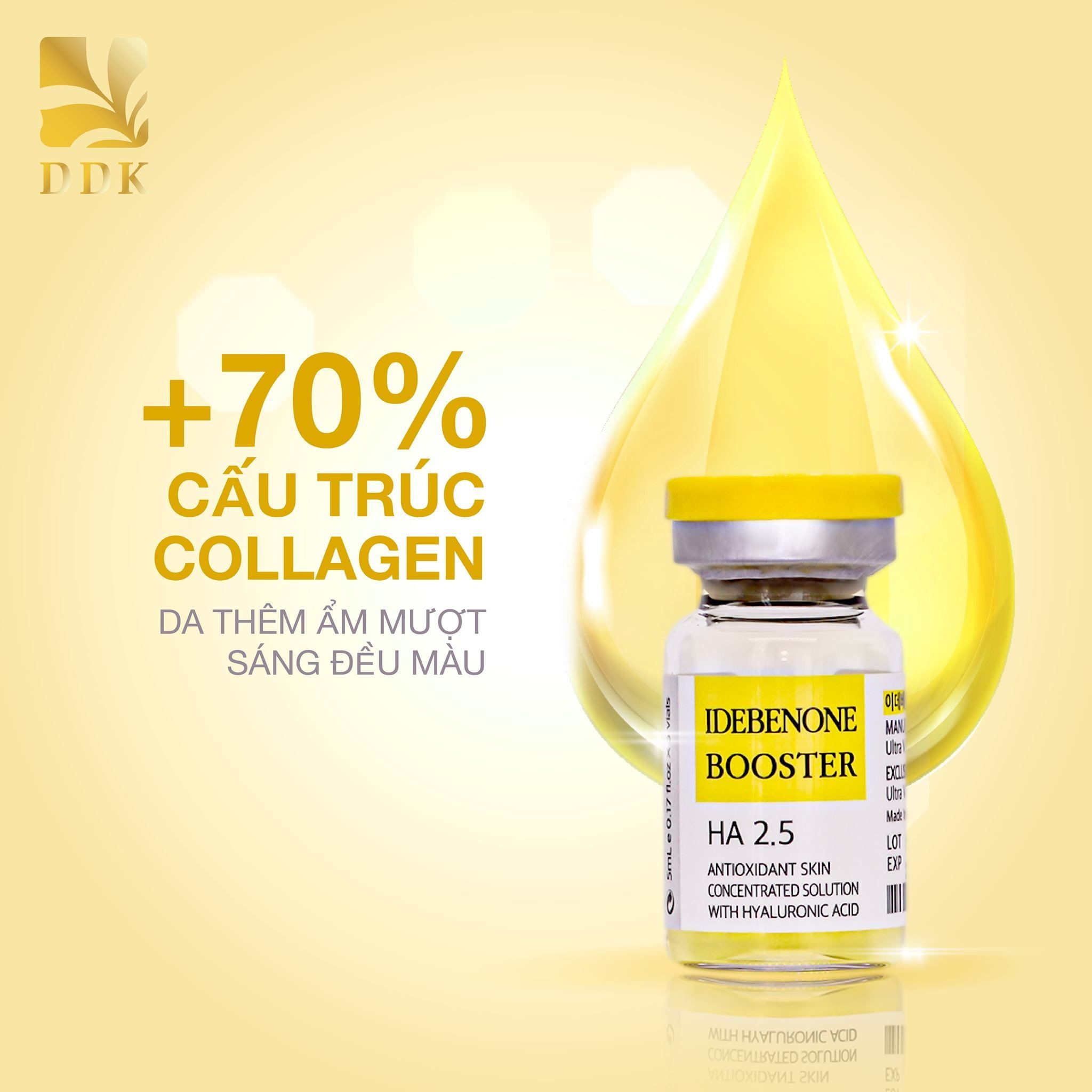 Ngoài ra, Tinh chất Meso ULTRA V Idebenone Booster trắng da, mờ nám, thâm sạm, căng bóng trẻ hóa da còn có khả năng tăng cường sản sinh collagen lên đến 70& chỉ sau 7 ngày sử dụng. Nhờ sự kết hợp của HA, nên da được cung cấp thêm độ ẩm ổn định, giúp da luôn trong tình trạng căng mịn mượt mà.